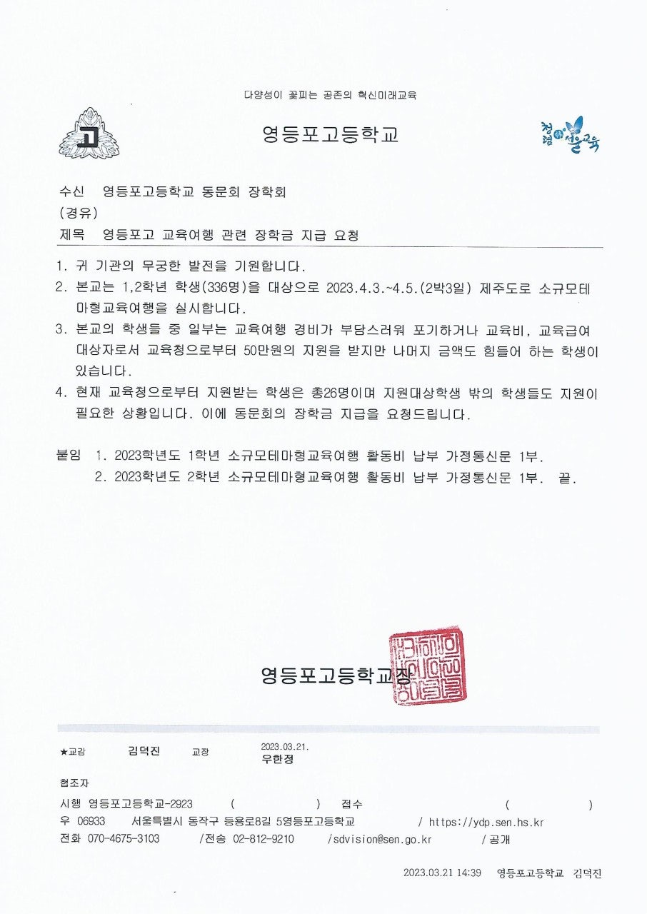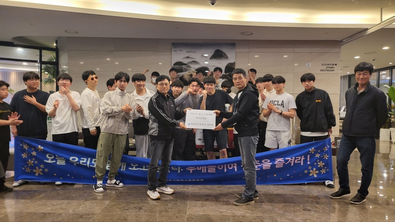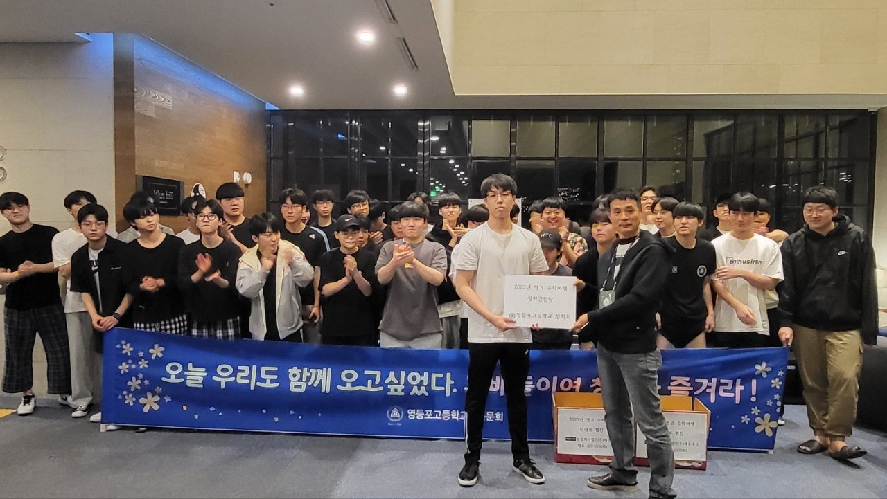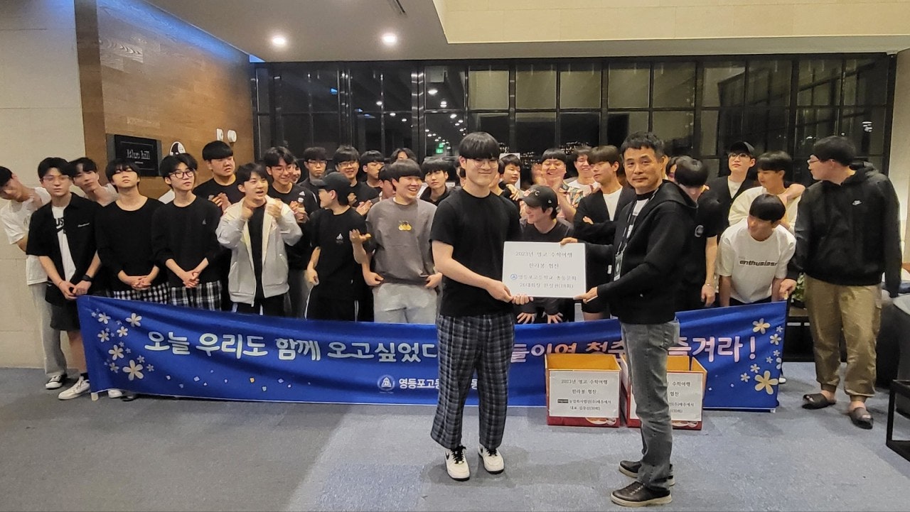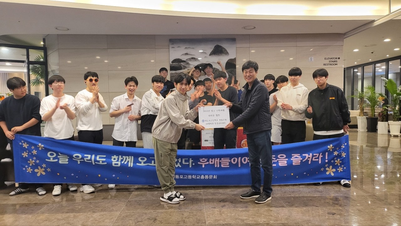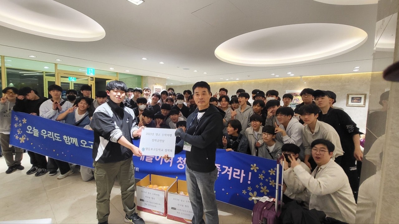 이에 고등학교때 수학여행을 갈수없다는 안타까운 소식을 접해듣고 사무처장님께서는 장학회 고대웅 이사장님, 이우승 이사장님께 말씀을드려 동문회 장학회에서 지원할수있게 도움을 요청하였고 동문회 사무처에서도 후배들에게 응원차 음료수라도 찬조할수있게 행사에 도움을 주려고현 동문회 회장님이신 26대 한성권 회장님, 박상일 감사님에게 의견을 전달하여 행사지원을 준비 하던중 김덕진 교감선생님께서 장학금과 수학여행 음료수를 지원해주심에 장학회와 동문회에 큰 감사를 표하시며 이번기회에 영등포고등학교 장학회와 총동문회의 중요성과 학교와의 교류에 있어 홍보할수 있는 방법에 대해 논의하던중 사무처에서는 후배들에게 총동문회가 직접 수학여행지에 동반하여 장학금과 간식을 제공하는것으로 결정이되어 이에 한성권 회장님께 건의하여 3월27일경 회장님의 승낙을 받아 문화체육국장 김찬수(24회), 조재원(31회) 두명이 총동문 대표로 빠듯한 일정속에서도  진행하는 것으로하여 음료수가 아닌 제주원산지인 한라봉으로 지원하기로 결정하였고, 이에 제주도에서 10여년째 감귤농장을 운영하는 농업회사법인(주)제주에서 김무신(30회)동문의 도움을 받아 김무신 동문이 직접 생산하는 한라봉을 지원하기로 하여 4월 3~4일 제주도를 방문하여 후배들을 만나고 왔습니다.