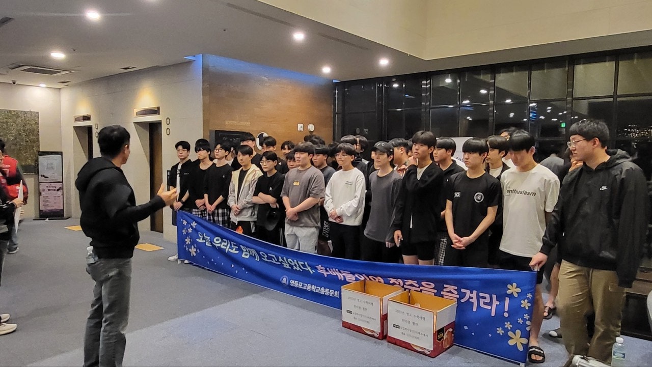 후배들의 숙소에 방문하여 교감선생님께서 총동문회에서 장학금과 간식을 제공하기위해서 선배님들이 제주도까지 직업오신것을 소개하는순간 후배들의 열화와 같은 박수와 성원에 가슴 뿌듯함이 이루말할수 없을정도로 벅차오름에 총동문회의 위상을 느낀 순간이였습니다.